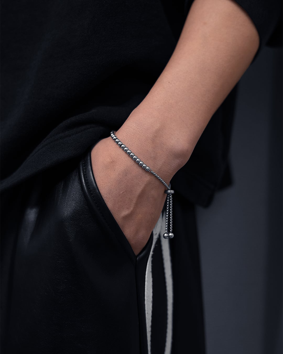 等間隔に連なるボールチェーンが、素肌にさりげないリズムと陰影を生み出し、主張しすぎない色気を手元に添えます。